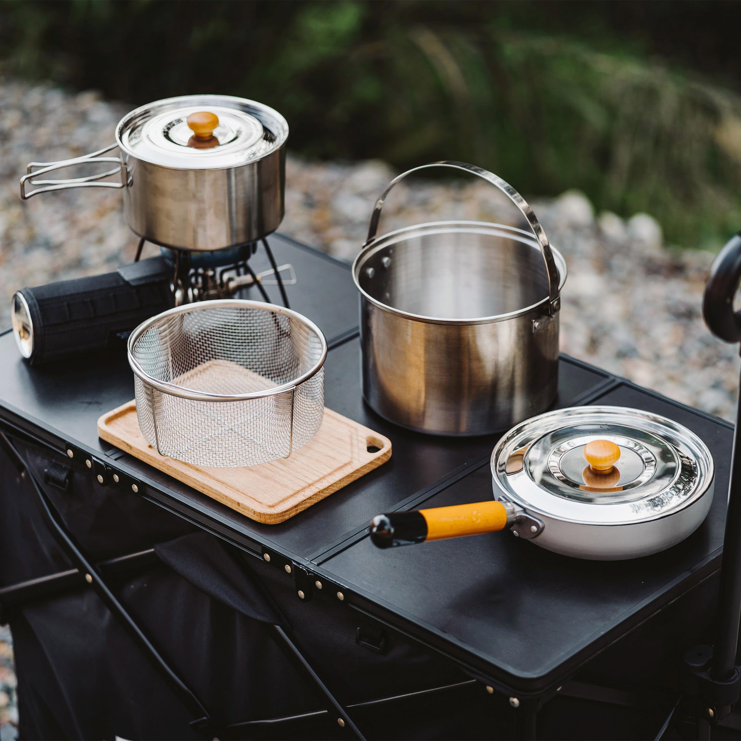 Stainless steel set with pot, pan, and strainer basket — everything you need, nothing you don't. Works on camp stoves, gas, and induction.